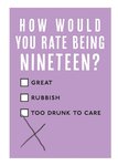 Front of card: Bold typography with checkboxes on a purple background. Text reads: "HOW WOULD YOU RATE BEING NINETEEN? GREAT. RUBBISH. TOO DRUNK TO CARE."