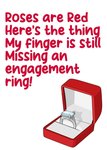 Text reads: "Roses are red here's the thing my finger is still missing an engagement ring!".