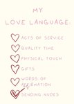"My love language: Acts of service. Quality time. Physical touch. Gifts. Words of affirmation. Sending nudes."