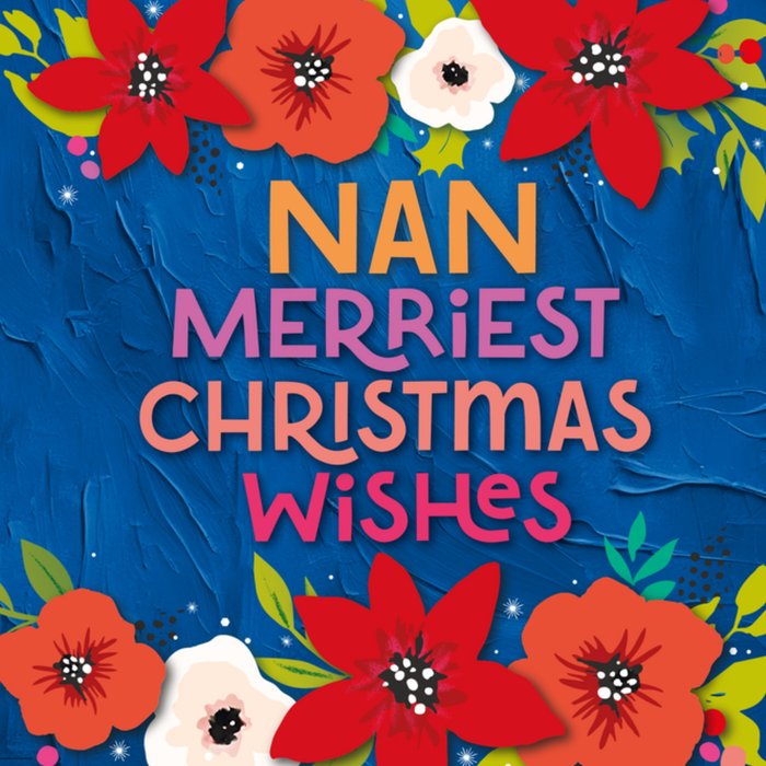 Featuring bright red poinsettias and white blossoms with colourful leaves and bold typography for Nan, on a deep blue painted background.