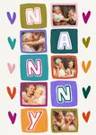 Front of card: This design features 5 colourful photo upload frames and 5 coloured blocks containing a letter in each one that spells out the word "Nanny." surrounded by colourful love hearts.