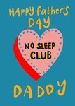 A colourful and playful Father's Day card featuring a pink heart with polka dots and bold text reading "No Sleep Club". Perfect for celebrating a sleep-deprived new dad with a sense of humour.