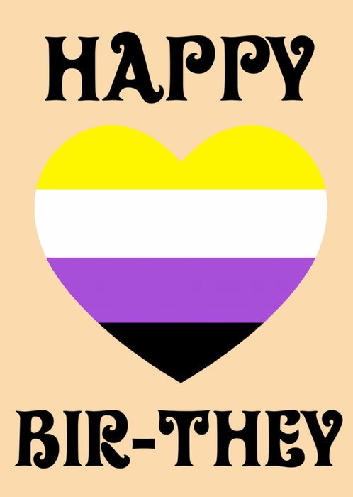 A joyful and inclusive birthday card featuring a large heart in the colours of the non-binary pride flag, yellow, white, purple, and black. The bold retro-style font spells out a punny pronoun greeting, celebrating gender diversity.