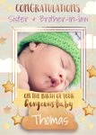 Front of card: Illustration of little stars and clouds with photo upload and text on a green and gold glitter striped background. Text reads: "Congratulations sister & brother-in-law on the birth of your gorgeous baby Thomas". Editable name and text.