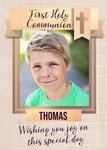 Front of card: Illustration of a religious cross with photo upload and text on a light brown striped background. Text reads: "First Holy Communion. Thomas. Wishing you joy on this special day". Editable name.