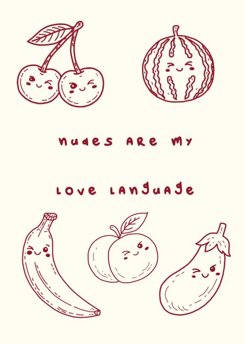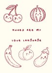 Featuring cute line drawings of smiling fruit including cherries, a watermelon, a banana, a peach and an aubergine around hand-lettered wording on a cream background.