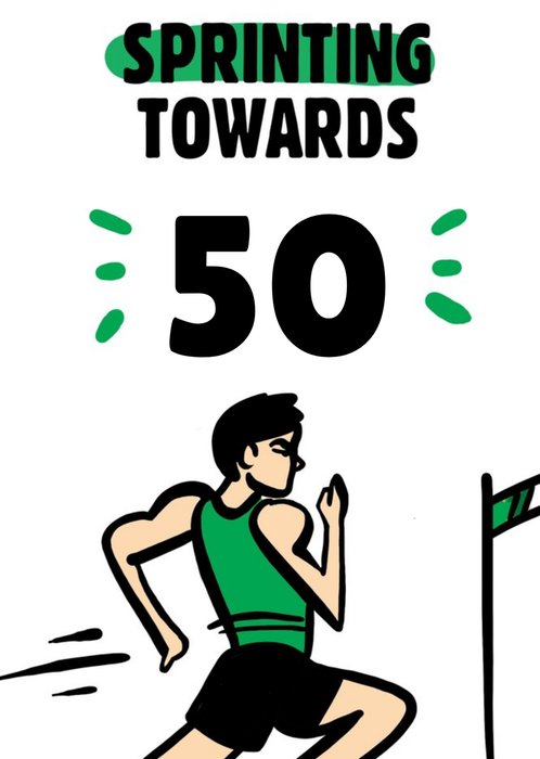 Ilustration of male white sprinter. Customisable age. Text reads:"Sprinting Towards 50"