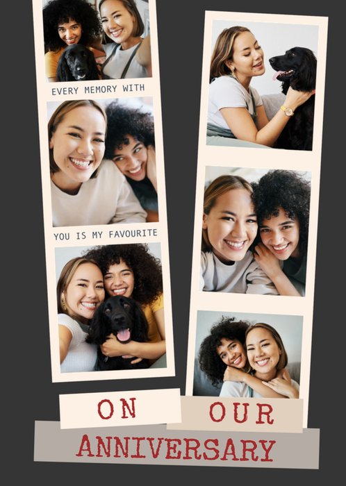 A romantic dark grey card design with six photo upload frames arranged in two columns. The text appears in a vintage red typewriter font on beige paper-style strips.