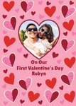 Front of card: Featuring a heart shaped photo frame surrounded by hearts with smiley faces. Text reads: "On our first Valentine’s Day Robyn". All text can be personalised!