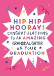 Front of card: Featuring colourful typography in a flash burst on a pink background. Text reads: "Hip hip hooray! Congratulations to an amazing granddaughter on your graduation". 'Granddaughter ' can be personalised!