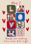 Front of card: This design features 8 colourful blocks, 4 of which are photo upload frames and the others containing a letter in each one that spells out the word "Love." Hearts sit on either side with red hand-drawn typography above and below on a cream background.
