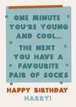 "One minute you're young and cool... the next you have a favourite pair of socks". All text can be personalised!