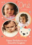 Front of card: One Today Daughter's Photo Upload Birthday Card Illustration of a bear with three circular photo frames. Text reads: "One today happy birthday to our beautiful daughter". 'Happy birthday to our beautiful daughter' can be personalised!