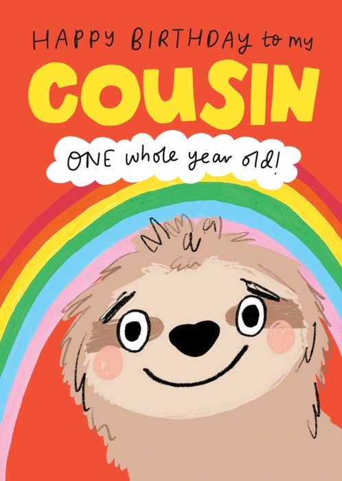 A cute, fun design featuring an illustration of a sloth with a colourful rainbow behind and playful, hand-drawn text above. The design sits on a warm orange background.