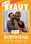 Front of card: Bold typography, on a orange background with photo frame in centre. Text reads: "To my beaut of a Boyfriend love you Michael xxx" With editable photo and text.