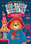 This is a greeting card featuring Paddington Bear in a blue coat, holding a treat, against a funfair background that includes a carousel, helter-skelter, Ferris wheel, and stars on a dark blue background.