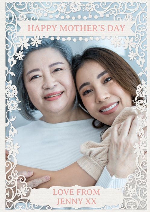 A pretty and loving Photo Upload Mother's card featuring an intricate floral and ornamental paper texture effect frame. There is a fullsize photo upload area inside the ornate frame, taking up the whole design.