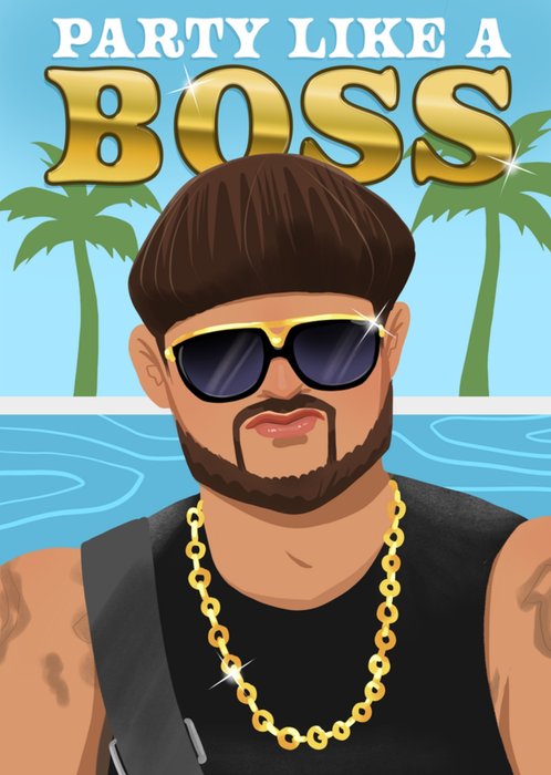 Illustrated poolside scene with palm trees and a stylish bearded man wearing sunglasses and a chunky gold chain. Large glossy gold lettering sits above for a bold, cheeky party vibe in a bright, summery colour palette.