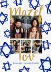 A happy and celebratory Hanukkah card featuring five photo upload areas surrounded by hand-painted stars of David, 'Mazel Tov' is hand-script lettering in a gold glitter effect.