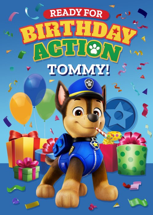 Featuring PAW Patrol's Chase in a blue police uniform, this greeting card features colourful balloons, wrapped presents, and confetti on a blue background, making it perfect for a child's birthday.