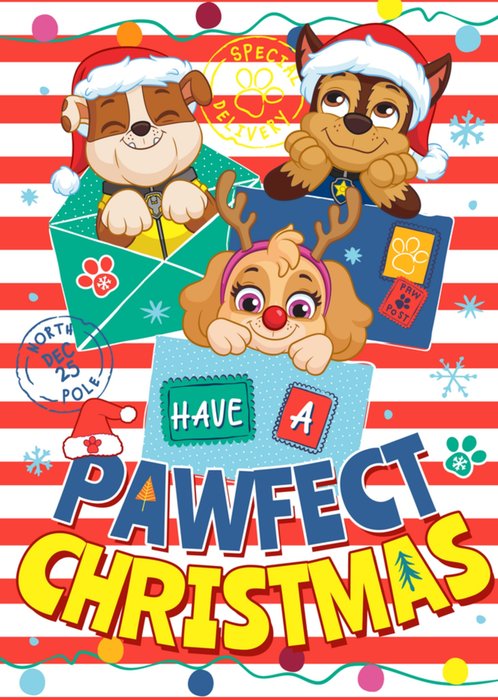 This Paw Patrol Christmas card design features three beloved characters dressed in festive outfits, including Santa hats and reindeer antlers, popping out of colourful envelopes against a red and white striped background. The playful text “Have a Pawfect Christmas” is prominently displayed in bold, festive fonts, surrounded by snowflakes, paw prints, and holiday-themed stamps.