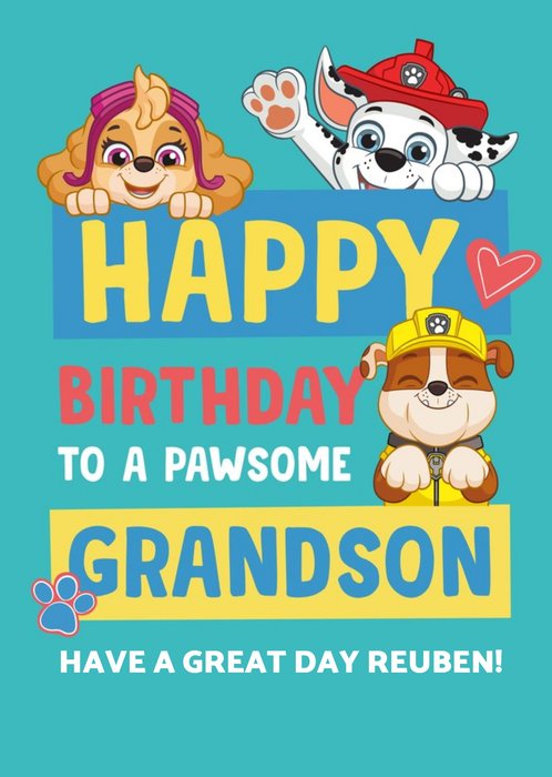 Front of card: Paw Patrol Pawsome Grandson Birthday Card Features illustrations of Rubble, Skye and Marshall peering over text that reads: "Happy Birthday To A Pawsome Grandson Have A Great Day Reuben!". Reuben is customisable.