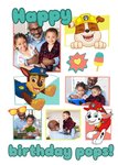 Features Rubble, Chase and Marshall, surrounded by 4 photo upload frames. The card is white with bright, colourful photo frames.