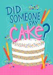 Front of card: Illustration of a birthday cake with candles and sprinkles with hand drawn lettering on a blue background. Text reads: "Did someone say cake?".