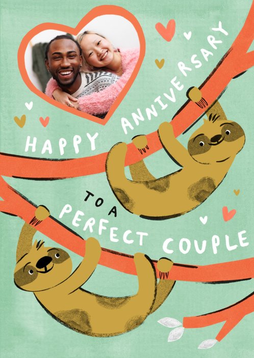Front of card: Featuring 1 heart-shaped photo frame with an illustration of 2 sloths hanging from coral branches, all on a green background with scattered heart illustrations & bold white & black typography.