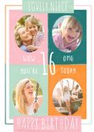 Front of card: Featuring four colourful sections with oval photo frames. Text reads: "Lovely niece wow omg you're 16 today happy birthday". 'Lovely niece' and '16' can be personalised!