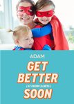 Front of card: Large photo upload are in the top half of the card with a blue panel below and large orange and cream type with editable name. Text reads:"Adam get better (at faking illness) soon." With customisable name.