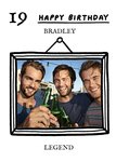 Front of card: Large photo upload area within a simple bold black illustration of a picture frame hanging on a white background with editable text above and below. Text reads: "19 happy birthday Eleanor. Legend" With customisable name and age and legend.