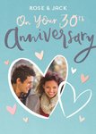 Front of card: One large heart-shaped photo upload area with a white edge and some smaller pink, cream and white hearts around it. Editable name spaces and 30th Anniversary message in handwritten text on an aqua background. Text reads:"Rose and Jack on your 30th Anniversary." With customisable names.