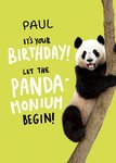 Front of card: Panda-monium Birthday Card Photographic image of a panda on a lime green background. Text reads: "Paul it's your birthday! Let the panda-monium begin!". 'Paul' can be personalised!