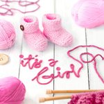 Front of card: Coloured photograph of pink knitted baby boots surrounded by pink balls of wool and thread that spell out "it's a girl" in lowecase letters.