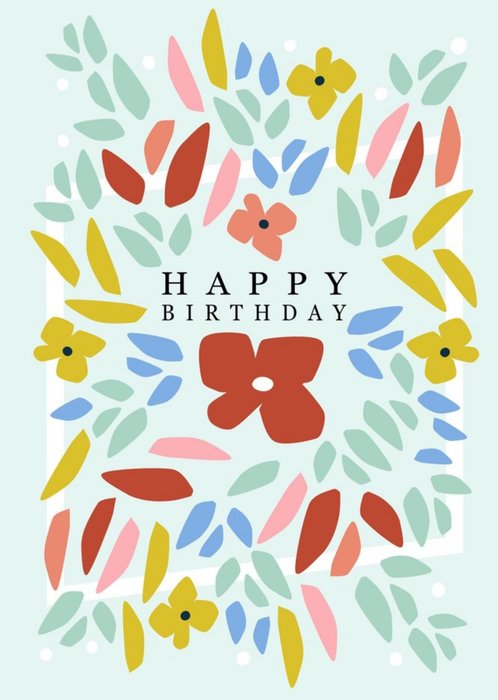 Picket + Vine Happy Birthday Card Front of card: Illustration of multi colourd leaves and flowers surrounding the words "Happy Birthday" in the center of the card. On a light green background.