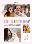 Front of card: Granddaughter's 13th Photo Upload Birthday Card Picture frames with colourful typography. Text reads: "13th birthday Granddaughter!". 'Granddaughter!' can be personalised!