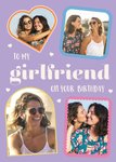 Front of card: Four colourful photo frames, in different shapes including a love heart and a square, with text in the center of the card. Text reads: "To My Girlfriend On Your Birthday".