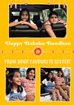 Front of card: Colourful Raksha Bandhan Photo Upload card with multiple photo frames and colour, including yellow and red with text. Text reads: "Happy Raksha Bandhan from your favourite sister!". Editable text.