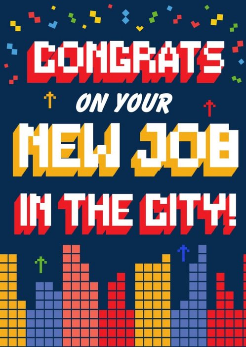 Game In retro gaming pixel design. Caption reads Congrats On Your New Job In The City, there are no editable options. The card design features a city scape made up of pixelated blocks. The card background colour is navy.