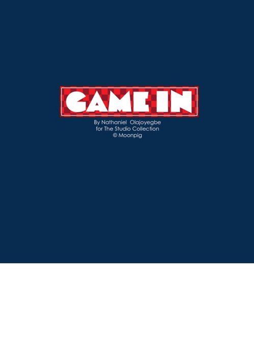 The rear of the card has a navy background with bothe the Moonpig and Game In logos.