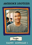Poet and Painter - One photo upload option, freamed in a navy, orange and blue frame. The caption reads non editable Awesome Brother, editable recipients name, followed by a non editable Happy Birthday! The card background colour is a teal blue.