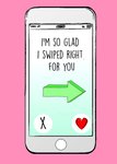 Poppy and Mabel bright, graphic illustration of a smart phone showing an online dating app.The non editable caption reads I'm So Happy I Swiped Right For You. The card background colour is bright pink.