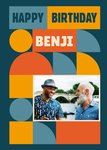 Poster Prints retro Bauhaus inspired design. The card has one photo upload option and a non editable caption that reads Happy Birthday, followed by the editable recipient's name. The card background colour is dark blue.