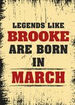 Front of card: March Birthday Card Red and black typography on a grunge background. Text reads: "Legends like Brooke are born in march". 'Brooke' can be personalised!