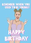 Front of card features topical illustration of a popular singer sticking her tongue out, doing peace signs, with text above and below.