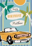 Featuring a retro illustration of a yellow convertible car, palm trees and the sun, with text in the middle.
