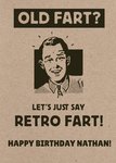 Front of card: Retro Fart! Funny Birthday Card Retro iIlustration of a laughing man on a brown paper textured background. Text reads: "Old fart? Let's just say retro fart!" and "happy birthday Nathan". 'Happy birthday Nathan' can be personalised!