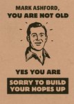 Front of card: Funny Retro Birthday Card Retro iIlustration of a laughing man on a brown paper textured background. Text reads: "Mark Ashford, you are not old yes you are sorry to build your hopes up". 'Mark Ashford' can be personalised!