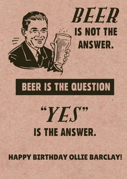 Front of card: Funny Retro Birthday Card Retro iIlustration of a man Enjoying a glass of beer on a brown paper textured background. Text reads: "Beer is not the answer. Beer is the question "yes" is the answer. Happy birthday Ollie Barclay!". 'Happy birthday Ollie Barclay!' can be personalised!
